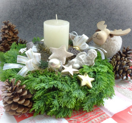 Zur Weihnachtszeit darf ein Adventskranz auf dem Festlich geschmückten Tisch nicht fehlen. Einen Strohkranz bewickeln Sie mit Tannen oder Koniferen-Zweigen der dann ca. 27cm Durchmesser hat. In der Kranzmitte wird ein Mosi eingesetzt um die Kerze dort zu befestigen. Um die Kerze herum kann nun nach Herzenslust dekoriert werden. Es stehen Ihnen die Unterschiedlichsten Materialien von Anisstern bis Zimtstange zur Verfügung um den Adventlichen Zauber mit nach Hause nehmen zu können. Der Kranz ist so gearbeitet, das Sie ihn zu Hause mit wenigen Handgriffen auch mit 4 Kerzen ausstatten können.