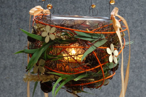 Kerzenschein ist ein ganz besonderes Licht. Geschützt in einem Glas umgeben von feinem Drahtgeflecht erleuchtet die Kerze den Raum oder die Terrasse. In diesem Kurs stellen Sie dieses Drahtgeflecht aus Wickeldraht her und schmücken es mit unterschiedlichen Materialien wie zum Beispiel Moos, Perlen, Bast oder Bändern, Zweigen, Pettingrohr, Holzblumen, Erlenfrüchten oder Bucheckern aus. In der Mitte wird ein Glas für die Kerze eingearbeitet, so das kein Luftzug das Licht löschen kann. Das Geflecht kann auf dem Tisch platziert werden oder aber mit Draht ins Fenster oder nach Draußen gehängt werden.